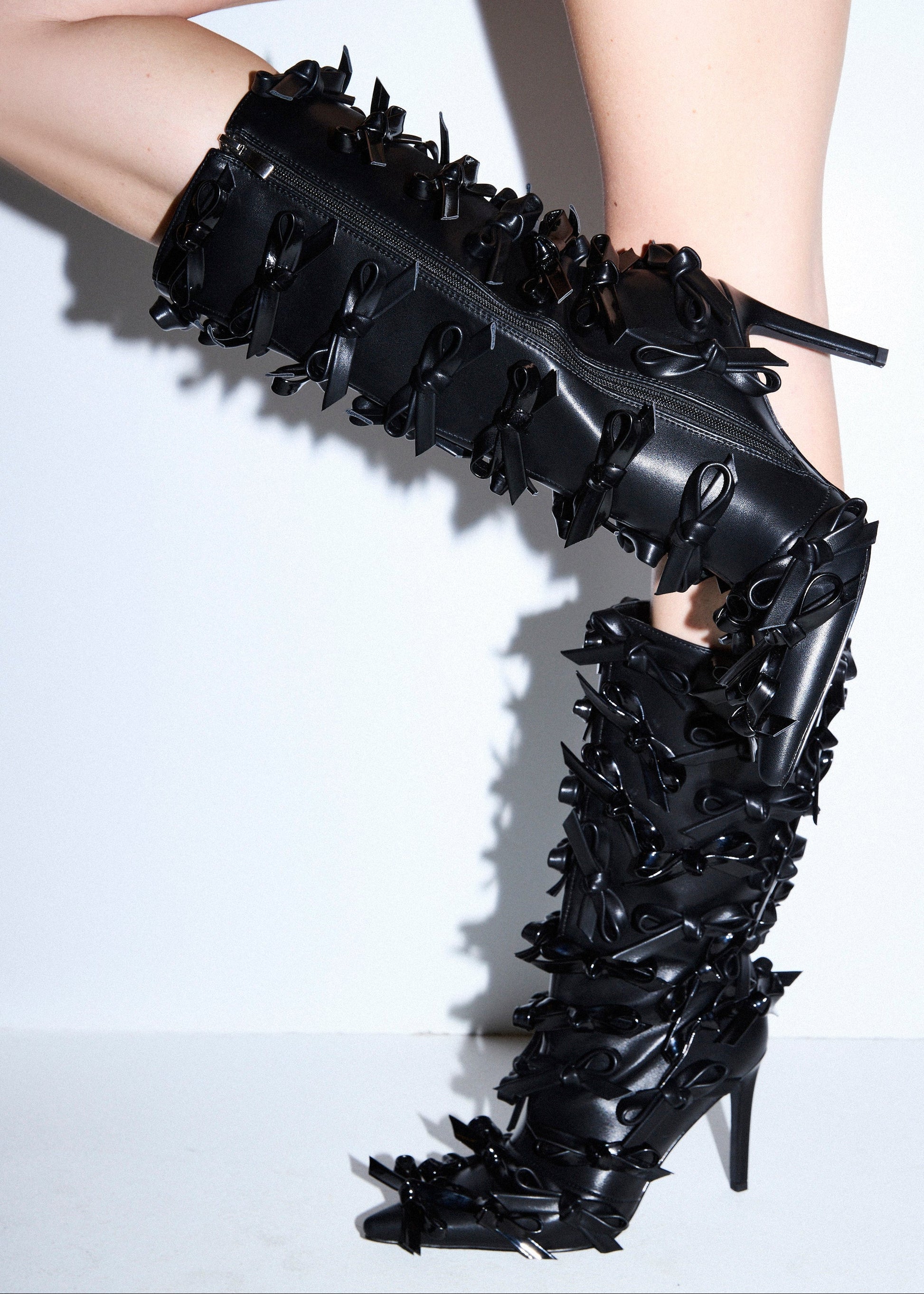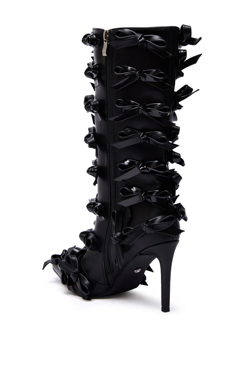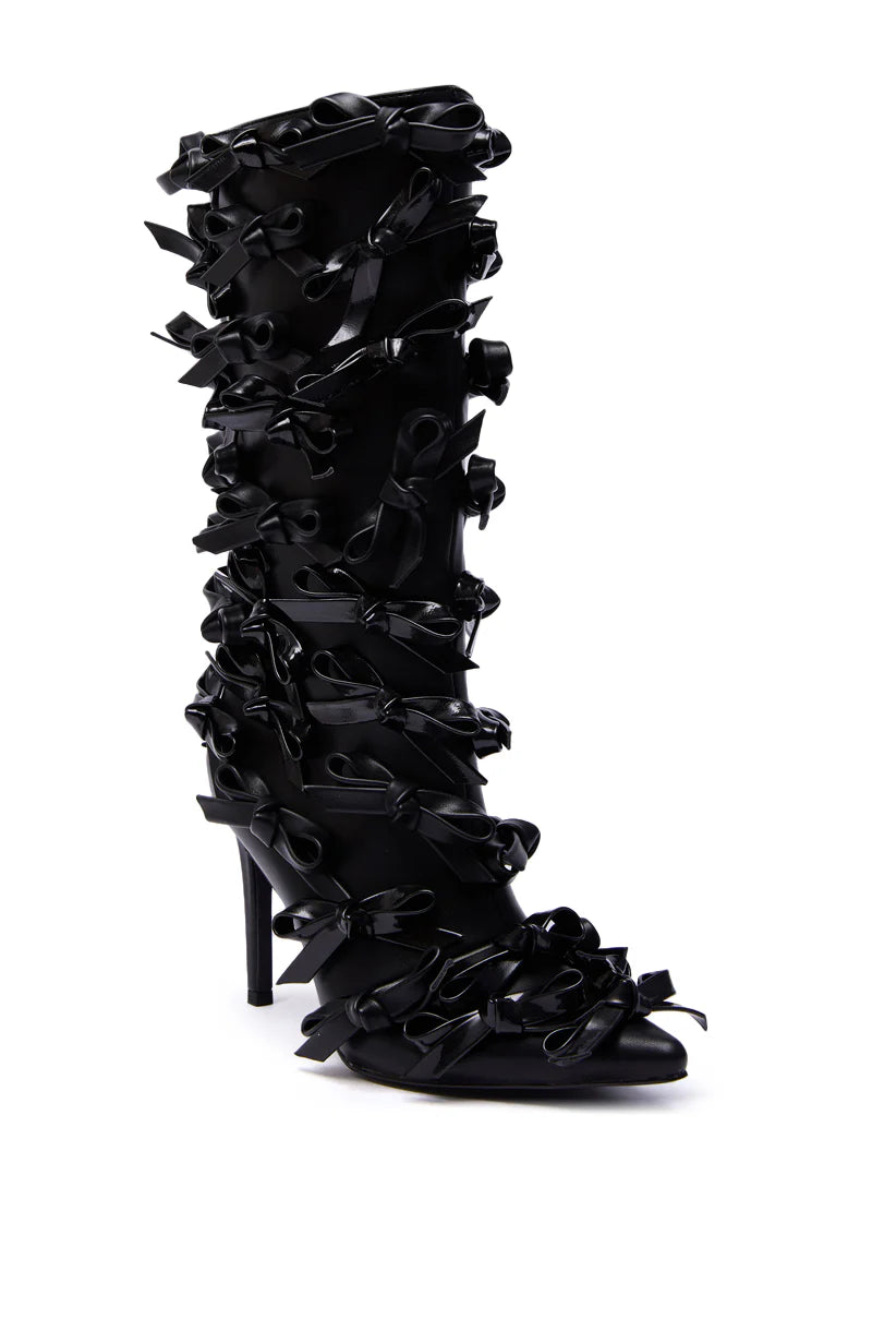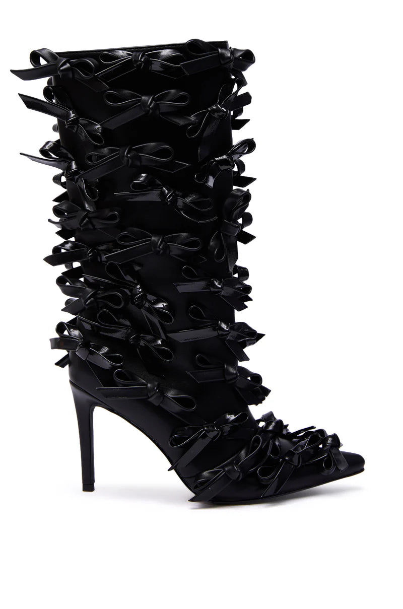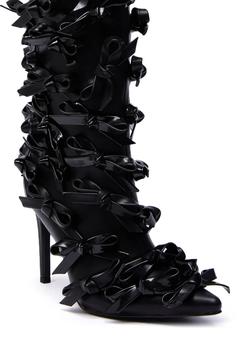 Bottine noire en similicuir verni, ornée de nœuds ton sur ton sur toute la surface. Dotée d’un bout pointu, d’un talon aiguille fin, d’une tige mi-mollet et d’une fermeture zippée à la cheville pour un style audacieux et raffiné.