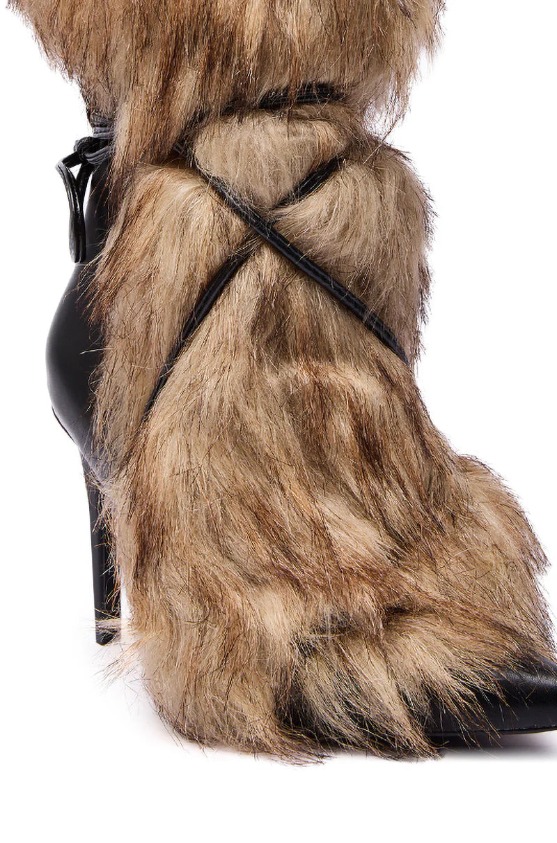 Bottine élégante en similicuir noir, dotée d’une tige mi-mollet doublée de fausse fourrure moelleuse. Des lanières en similicuir à nouer entourent la chaussure pour un style raffiné. Complétée d’un bout pointu, d’un talon aiguille fin et d’une fermeture zippée intérieure discrète, elle s’enfile facilement pour des soirées d’hiver audacieuses.