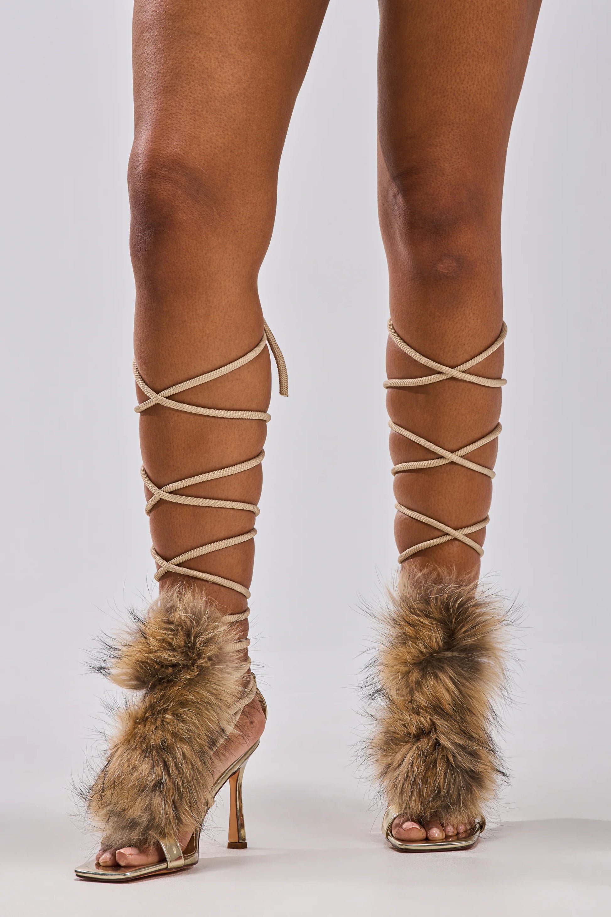 Un style resort audacieux. Les sandales 'Dune' fusionnent la texture douce de la fausse fourrure avec des brides en corde audacieuses qui s'enroulent autour du pied et de la cheville. Le modèle est monté sur un talon aiguille élancé d'environ 11,5 cm, offrant une silhouette très féminine. La fausse fourrure de couleur beige (tan) et les détails en corde tressée apportent une touche de luxe estival unique. Ces sandales sont parfaites pour les fêtes, les dîners sophistiqués ou les tenues de vacances. Matière : Dessus en Fausse Fourrure et Synthétique ; Semelle extérieure en Caoutchouc.
